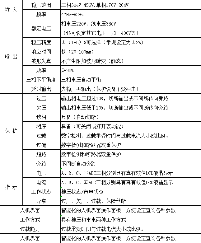 当出现过压、欠压时可在1秒内保护或者不间断自动转换至旁路工作,并且具有完善的缺相、过载、短路保护及故障后声光报警功能